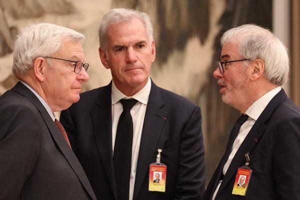 12月4日,中国北京,法国巴黎银行董事长乐明瀚(左)、法国商务投资署董事局主席帕斯卡尔·卡尼(中)和法国法孚集团主席弗雷德里克·桑切兹(右)陪同马克龙总统访华并出席中法企业家委员会第七次会议。图为他们在会议期间交流。视觉中国供图