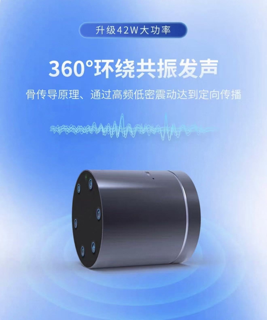 △猛牙音响的介绍页面中显示,这是一款利用骨传导原理,高频低密震动达到定向传播的音响设备。
