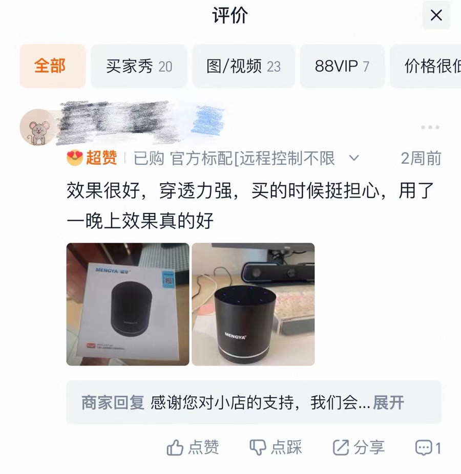 “还有更有效的。”随后,小莫又给记者发来了一个商品链接,打开后记者看到,这是一款品牌名为“猛牙”的共振音箱,售价为398元。商品页面显示,该音箱为“360度环绕共振发声”,通过“骨传导原理、高频低密震动达到定向传播”。“月售40+”“1000+人看过”,以及商品评价页面中“穿透力非常好”等表达,都诱导着消费者。