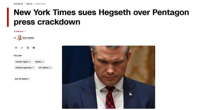 据美国有线电视新闻网(CNN)报道,美国《纽约时报》近日就五角大楼对媒体采访的新限制措施起诉美国国防部。